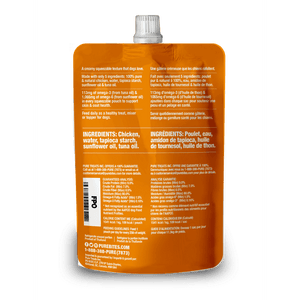 - Turn the bag over and look at our ingredients. Prepared with just 5 ingredients: 100% pure chicken, water, tapioca starch, sunflower oil and tuna oil. Proudly raised and prepared in Thailand with human-grade ingredients